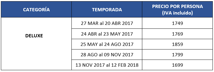 - El precio ofrecido es en base a contratación de paquete en alojamiento categoría deluxe a partir del 13 de noviembre de 2017. Puede verse modificado por variaciones en el precio del vuelo según la fecha. Para otra categoría de alojamiento o fecha de viaje, consúltenos su presupuesto.