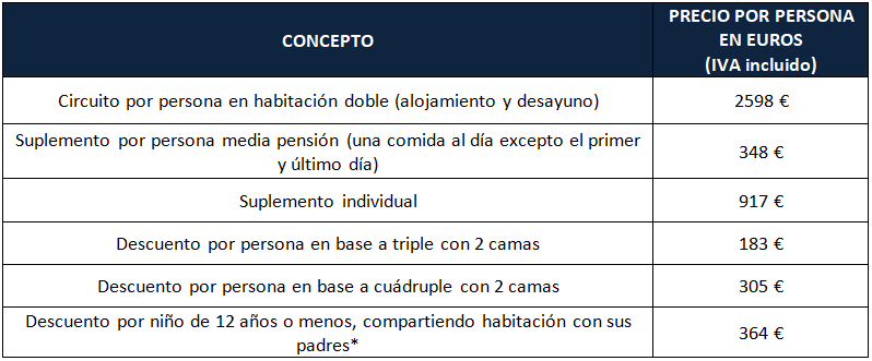 - Para noches extra, cualquier suplemento, visitas opcionales o combinaciones personalizadas para tus vacaciones, no dudes en ponerte en contacto con nosotros y estaremos encantados de hacerte tu presupuesto. (Precio de noches extra en los hoteles que os ofrecemos en el tour en la tabla adjunta).