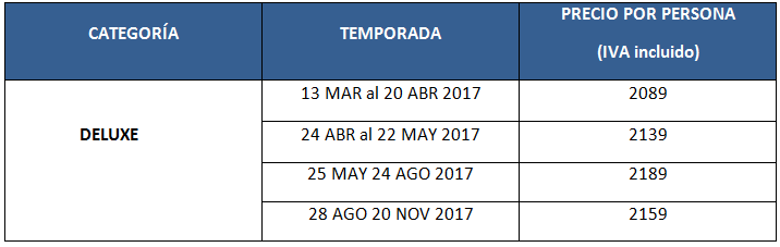 - El precio ofrecido es en base a contratación de paquete en alojamiento categoría deluxe, en habitación doble compartida, del 13 de marzo al 20 de abril de 2017. Puede verse modificado por variaciones en el precio del vuelo según la fecha. Para otra categoría de alojamiento o fecha de viaje, consúltenos su presupuesto.