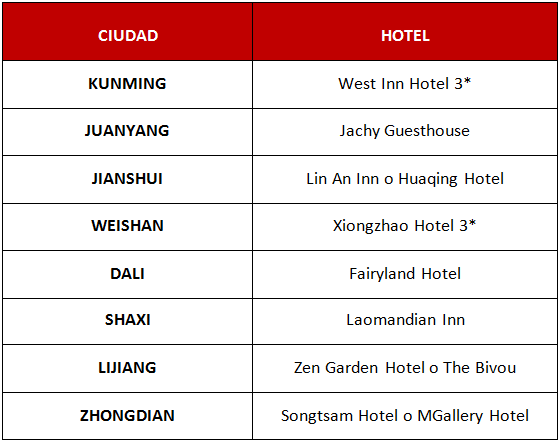 - Comidas (a excepción de la cena de bienvenida en Kunming)