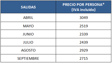 * Los precios de las salidas de mayo, junio, julio y septiembre están calculados para la primera salida que se realiza en dichos meses. Para el resto de salidas el precio puede variar debido a las fluctuaciones de precios de los vuelos internacionales. Están calculados en base a un grupo de 4 personas.