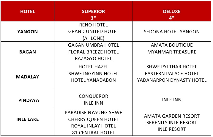 - Vuelo internacional y vuelos domésticos, Yangon – Bagan, Mandalay – Heho y Heho – Yangon con las tasas incluidas