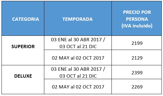 - El precio ofrecido es en base a contratación de paquete en alojamiento categoría superior todo el año, excepto del 2 de mayo al 2 de octubre de 2017. Puede verse modificado por variaciones en el precio del vuelo según la fecha. Para otra categoría de alojamiento o fecha de viaje, consúltenos su presupuesto.