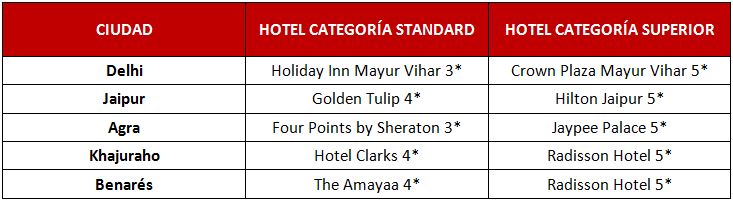 - ENTRADAS Y ACTIVIDADES: Todos los monumentos y las visitas indicados en el programa: Tumba de Humayun y Qutub Minar en Delhi; Palacio Samode; subida en elefante (o Jeep) y entrada al Fuerte Amber, Palacio de la Ciudad y Observatorio de Jantar Mantar en Jaipur; Fatehpur Sikri; Taj Mahal y Fuerte de Agra en Agra; Palacio-fortaleza de Orchha; templos eróticos de Khajuraho; y templo de la Madre India en Benarés