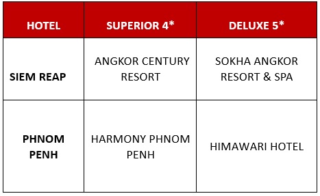- El alojamiento en los hoteles está sujeto a disponibilidad en el momento de efectuar la reserva. Si el hotel indicado está completo, se ofrecerá un alojamiento alternativo. Todas las clasificaciones de los hoteles están determinadas de acuerdo con las autoridades locales.