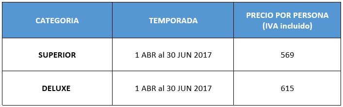 - El precio ofrecido es en base a contratación de paquete en alojamiento categoría superior de abril a junio de 2017. Puede verse modificado por variaciones en el precio del vuelo según la fecha. Para otra categoría de alojamiento o fecha de viaje, consúltenos junto con el presupuesto del viaje que quieren completar con esta extensión.