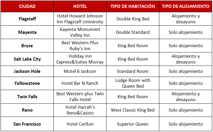 • 14 noches de alojamiento en USA en los hoteles indicados – régimen de solo alojamiento (salvo los hoteles indicados en el programa que incluyen desayuno continental).